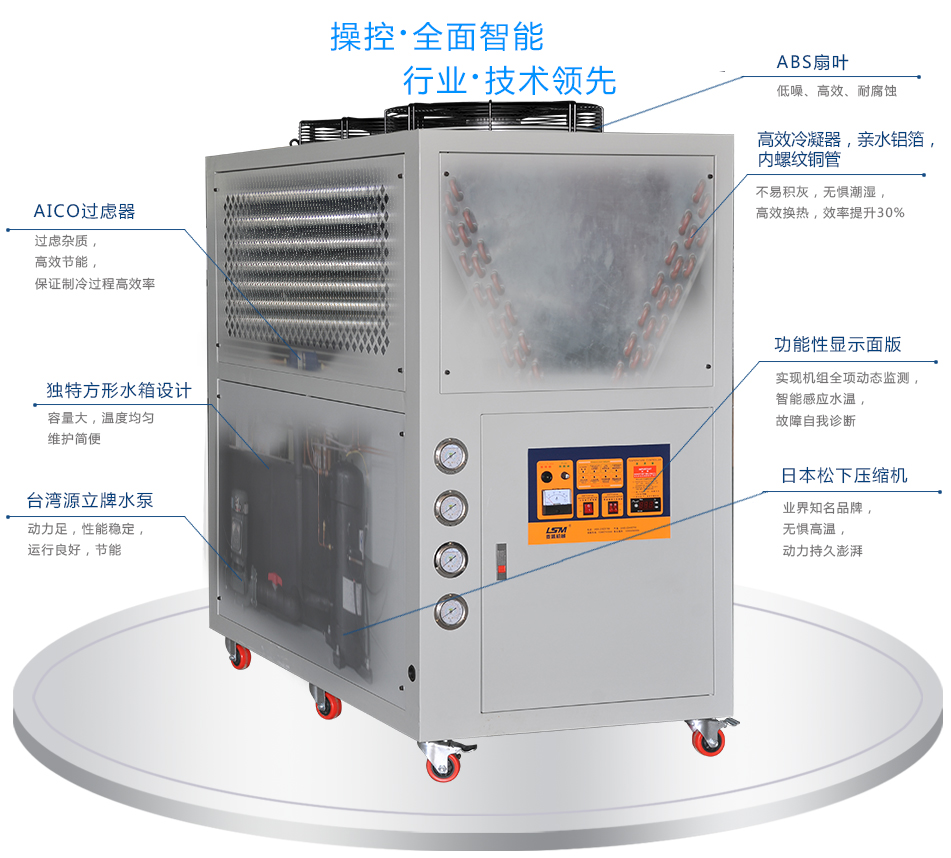 7、風冷機制冷機組是工業(yè)冷水機型號規(guī)格之一,將常溫下的水根據(jù)工業(yè)冷水機的制冷壓縮機致冷到一定的溫度以加強制冷磨具或設備,做為單機版應用,熱管散熱為內(nèi)嵌之散熱風扇,關鍵有三個互相聯(lián)絡的系統(tǒng)軟件:冷媒呼吸系統(tǒng)、循環(huán)水系統(tǒng)、家用電器自動化控制系統(tǒng)軟件。